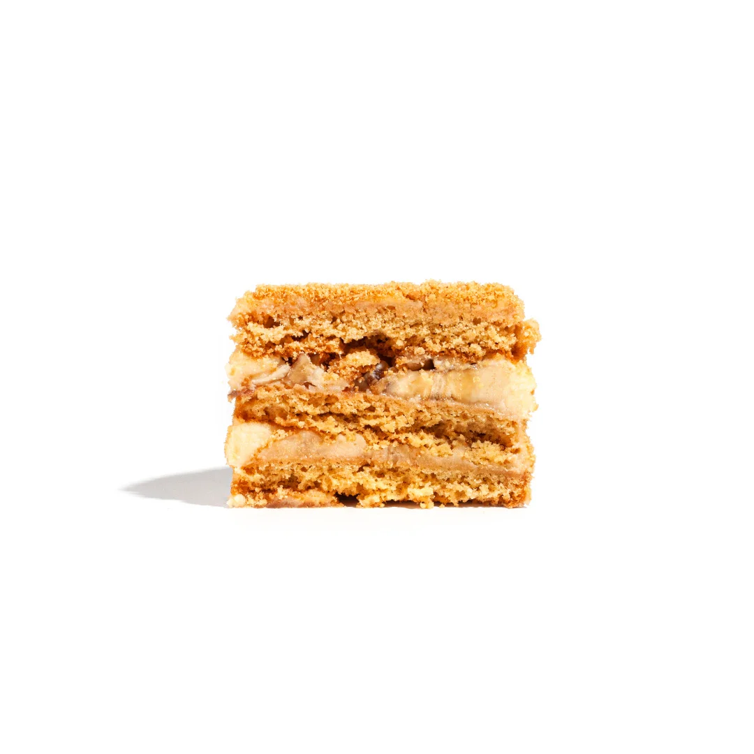 ۲.یک سمفونی بافتی: دسر دارای تعامللذت بخش از بافتها است. بیسکویت عسلی ترد ، خامه روسی خامهای، موز نرم و گردوی ترد، تجربه متفاوت و رضایتبخشی را در هر تیکه ارائه میدهند.