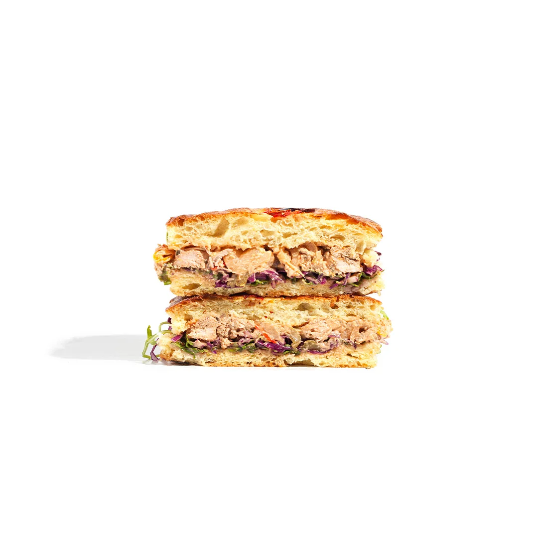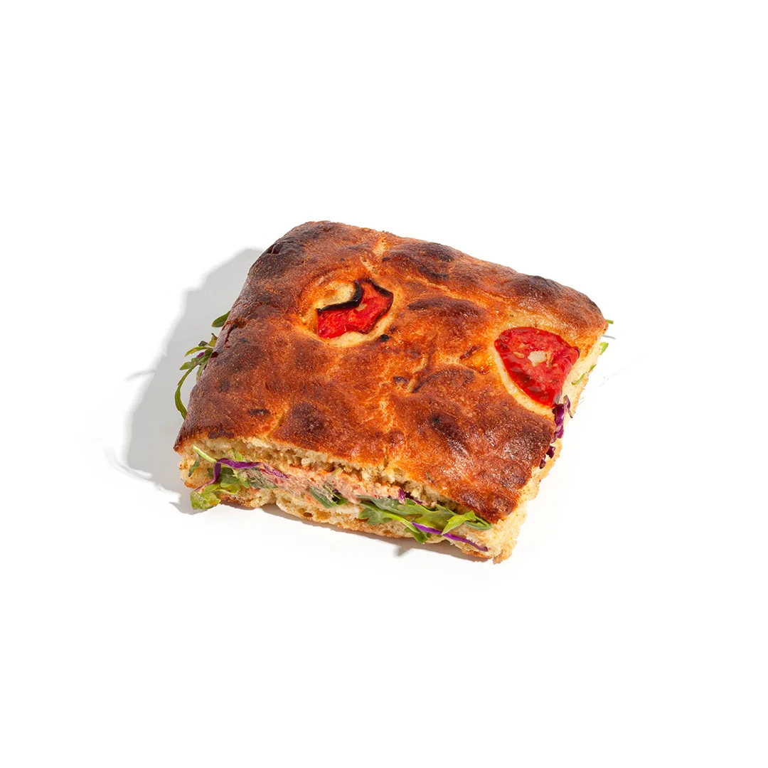 ۱.نان فوکاچیا: ما از نان فوکاچیا که به که به صرت روزانه پخت میشود، استفاده میکنیم ، که به دلیل بافت سبک و مطبوع، طعم ملایم شور و پوسته ترد لذت بخشی ایجاد میکند . پایهای عالی برای ساندویچ خوش طعم ما.