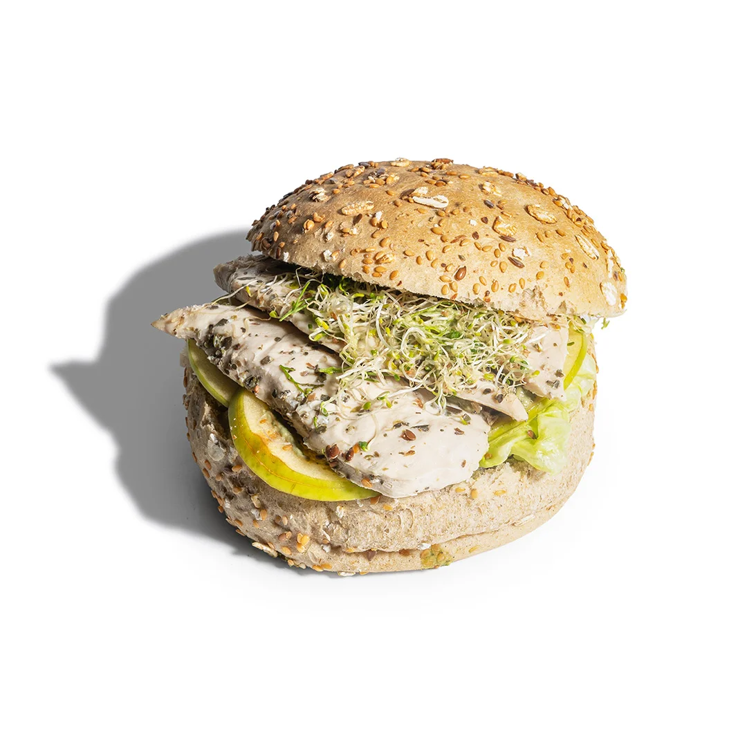 ترکیبات نان کامپینیه برگری ، فیله مرغ ، سس آووکادو ، سیب سبز فرانسوی ، جوانه شبدر ، کاهو پیچ ، شوید و ساقه پیازچه